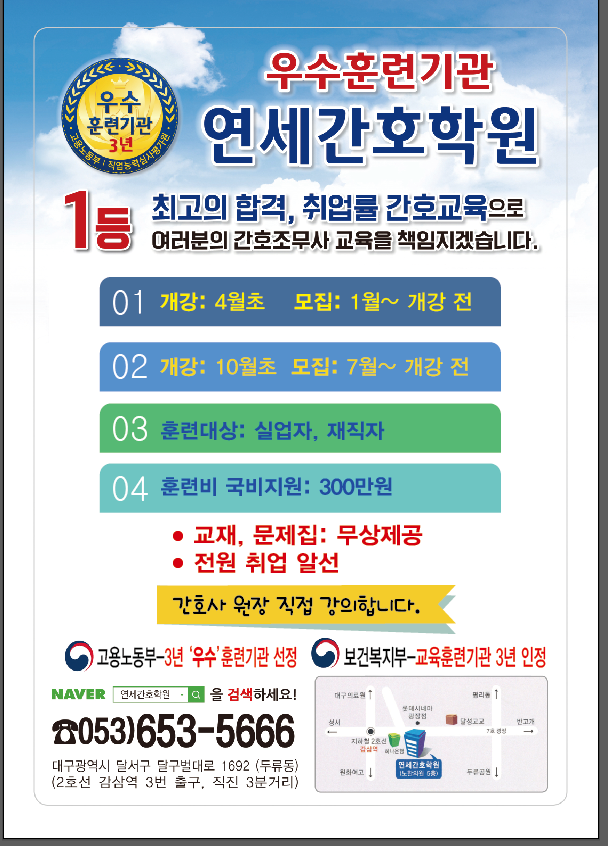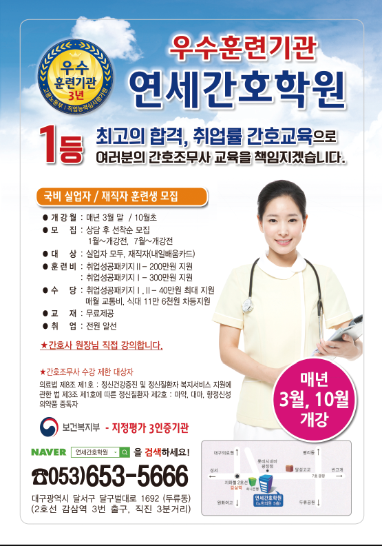 남교기 제2006호-792호 주소 : 대구광역시 달서구 두류동 495-3번지 5층 TEL : 053-653-5666 FAX : 053-623-5667 Copyright (C) 2008 YONSEI_NURSE. All rights reserved.